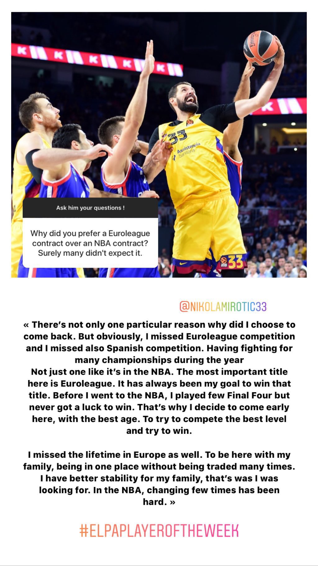 Euroleague Players Association On Twitter Elpaplayeroftheweek Nikolamirotic33 Answered To Fans Questions On Our Ig Account
