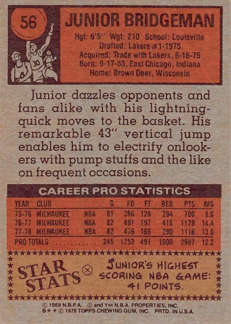 Amazon Com 1978 79 Topps Basketball Set Break Three 56 Junior Bridgeman Milwaukee Bucks Official Nba Trading Card From The Topps Company Collectibles Fine Art