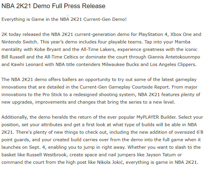 Nba2kw On Twitter Nba2k21 Demo Full Press Release Nba 2k21 Demo Builds Will Carry Over To Full Game As Expected 2kratings Will Be Different This Yr Due To Delayed Season
