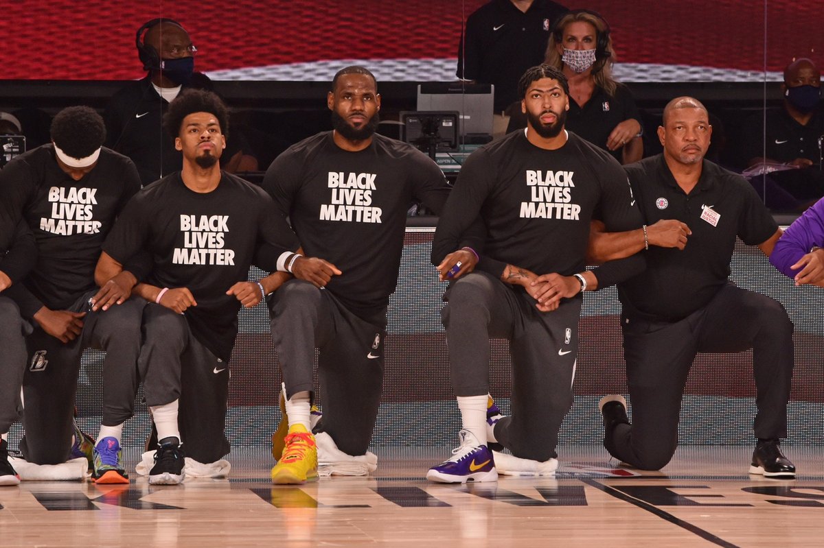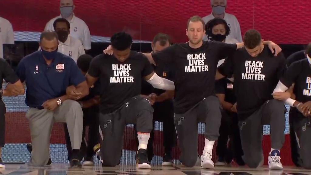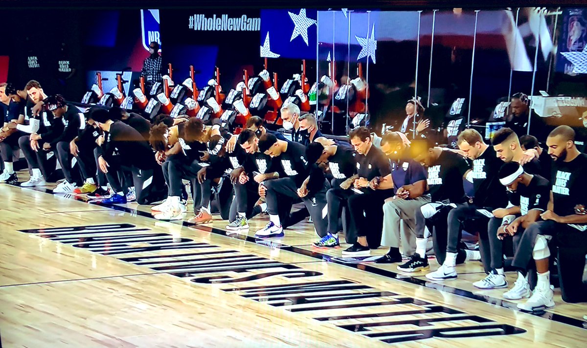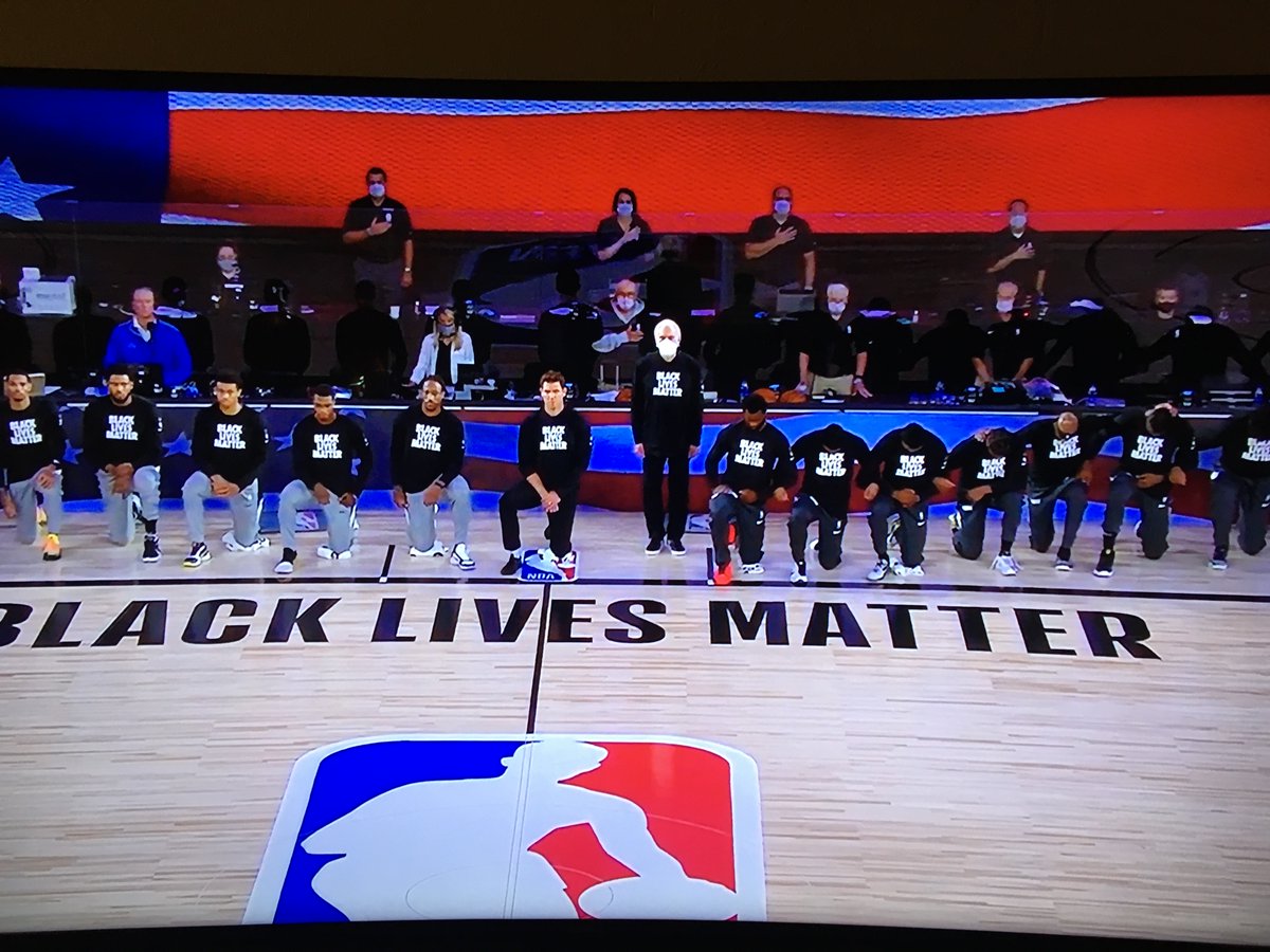 Sam Brock On Twitter The Opening To The Nba Restart All Players And Staff Members Wearing Blacklivesmatter T Shirts Link Arms And Kneel During The National Anthem Nbcnightlynews Nbcnews Https T Co Kfsuqpfeg6
