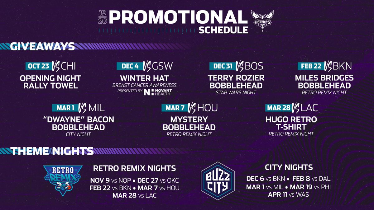 Charlotte Hornets On Twitter Check Out The Promotional Schedule For The 2019 2020 Season Https T Co U597nepccf