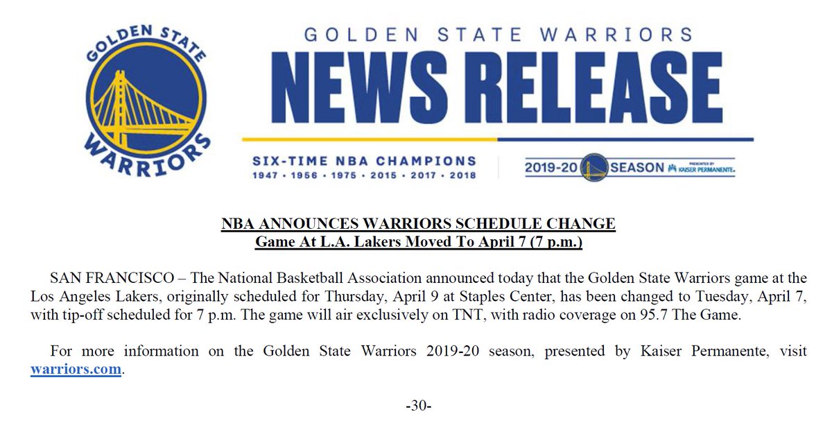 Nba schedule warriors 2020. Nba schedule 2020 nba mock draft. Get the latest matchups tip times and television listings for all playoff games. Nbas league office informed board of governors today that the 2020 21 season wont begin earlier than christmas day sources tell attheathleticnba atstadium.