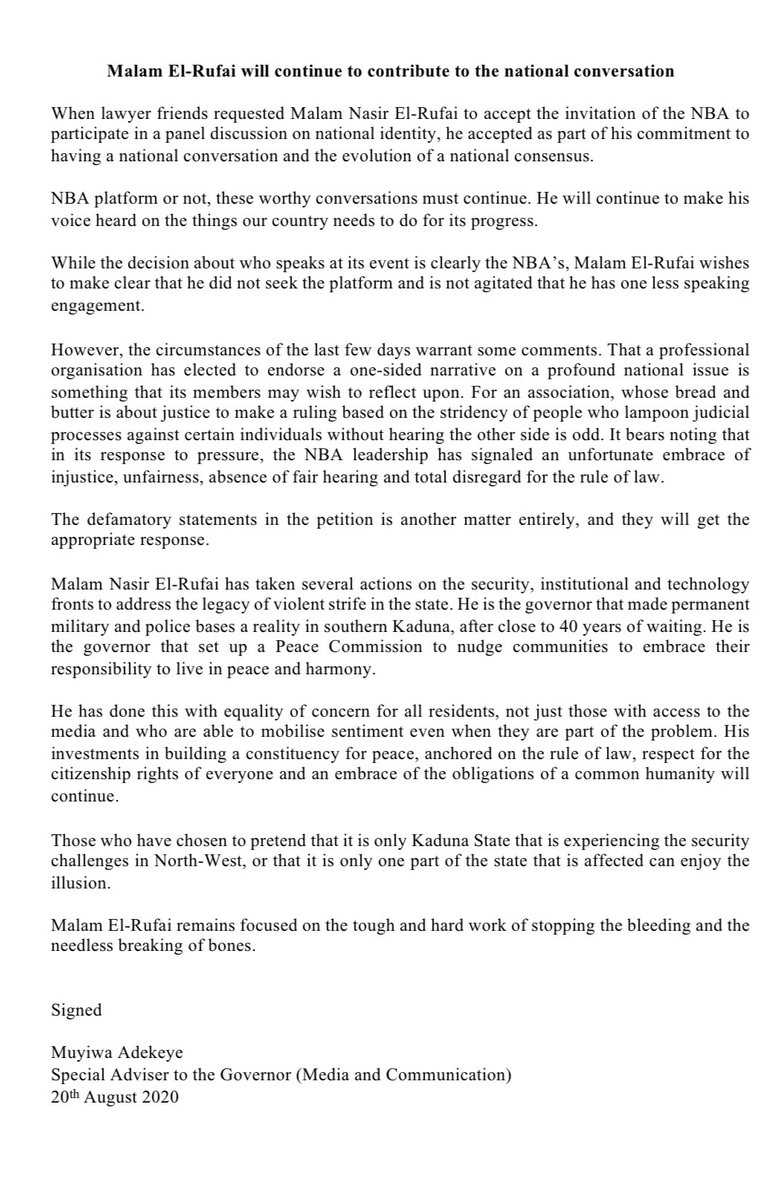 In Full Nba Vs Nasir El Rufai Kaduna Govt Speaks On Dadiyata Prosecution Of Odinkalu Maikori Ballason Others Thenigerialawyer