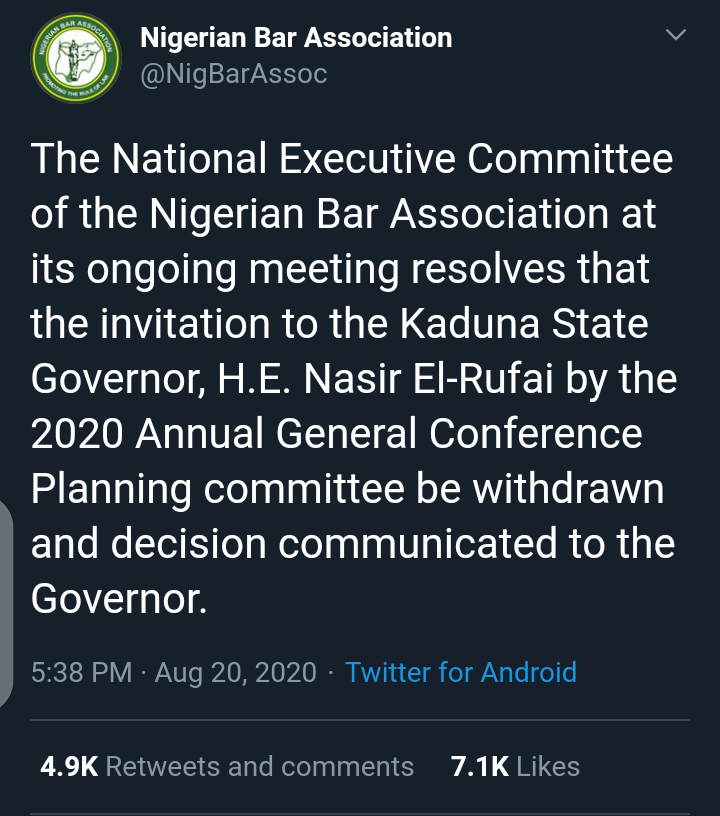 Bauchi Chapter Of Nba Threaten To Boycott Association S Agm If The Decision To Withdraw El Rufai S Invitation Is Not Reversed