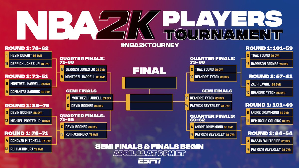 Nba 2k21 On Twitter Our Four Semi Finalists Are Locked Who Predicted These 4 Guys In Their Nba2ktourney Bracket Devinbook Vs Monstatrezz Deandreayton Vs Patbev21 Semi Finals Finals Start Tomorrow 4 11 At